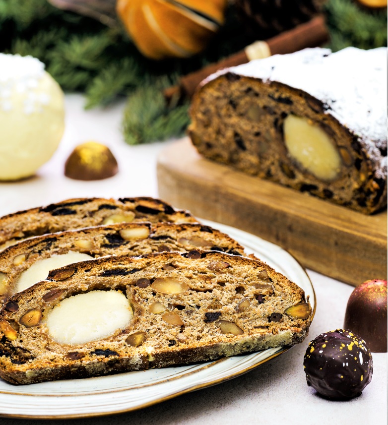 슈톨렌(Stollen) 안에는 럼에 절여진 숙성된 건과일, 과일 껍질, 마지팬(아몬드, 설탕을 갈아서 만든 페이스트) 그리고 아몬드나 호두 등의 각종 견과류가 듬뿍 들어가 있습니다. 그래서 굉장히 풍미가 깊은 빵이에요. 만드는 과정에서도 엄청난 정성이 들어간다고 합니다. 슈톨렌에 들어갈 건조 과일들은 럼에 절여서 무려 1~2년간 숙성시키는 과정을 거치기도 해요. 다 구워진 빵의 표면에는 버터를 바르고 식힌 후에 슈가 파우더를 듬뿍 뿌려줍니다. 풍미 높은 재료들 덕분에 맛은 굉장히 달콤하지만 칼로리는 매우 높습니다.