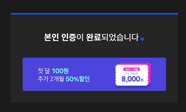 본인 인증까지 완료하니 할인 혜택을 주네요. 첫 달은 100원에 이용이 가능하다고 합니다.