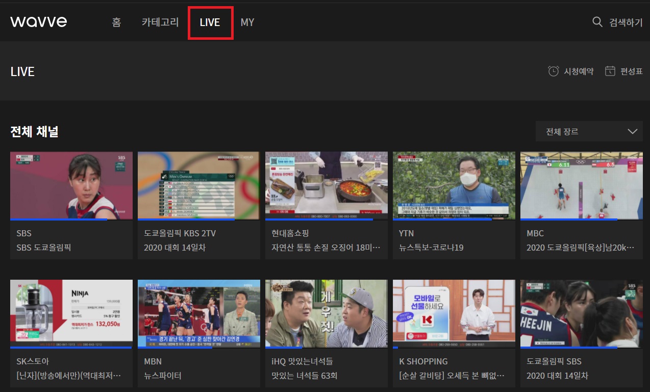 웨이브에 회원 가입을 하면 이용권을 구매하지 않아도 LIVE 방송 시청이 가능합니다. 덕분에 어제 올림픽 배구 경기를 LIVE로 볼 수 있었어요. 현재 웨이브에는 도쿄 올림픽 특별관이 개설되어 있습니다.